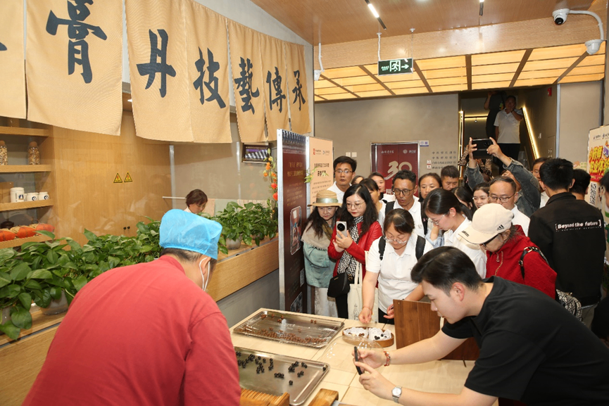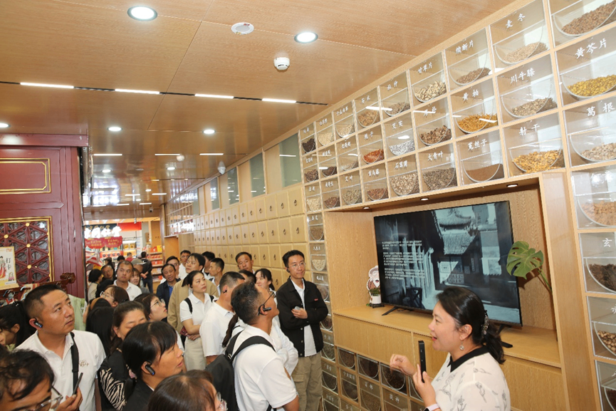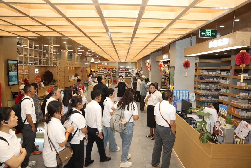 在金象复星公司副总经理张洋的讲解下,项目团队依次参观了药品与保健品区、非遗加工研学区、健康科普区、饮片区、文创区、中医诊所及智能代煎区等多个功能区域。在药品区,张洋详细介绍了道地药材的甄选标准与特色产品优势;非遗研学区内,嘉宾们体验了传统蜜丸搓制技艺,沉浸式感受中医药非遗文化的匠心传承;健康科普区以图文与实物相结合的方式,生动诠释“治未病”的中医智慧;最后,移步露台打卡区,众人俯瞰红墙白塔与胡同烟火相映成趣,一眼望尽古都风韵与时代新声。