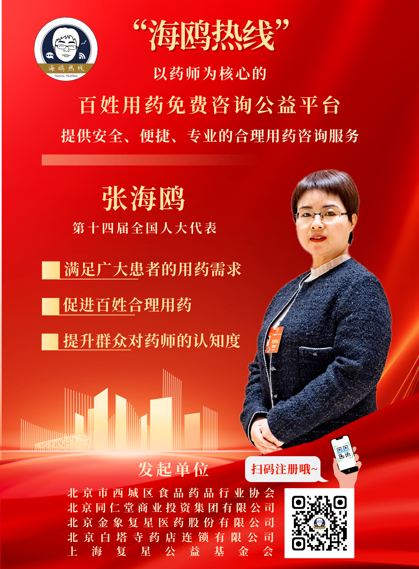 为了满足广大患者的合理用药需求,提高公众的用药水平,不断提升公众对执业药师的认知度,加强合理用药宣传指导,北京市西城区食品药品行业协会、北京同仁堂商业投资集团有限公司、北京金象复星医药股份有限公司以及北京白塔寺药店连锁有限公司和上海复星公益基金会,共同发起建立了一个以药师为核心的百姓用药免费咨询公益平台——“海鸥热线”,希望为广大患者提供一个安全、便捷、专业的用药咨询服务平台。